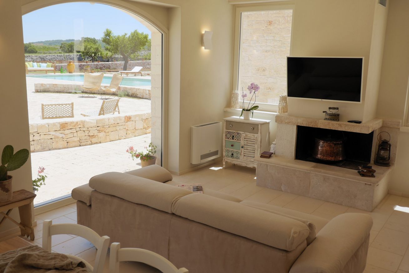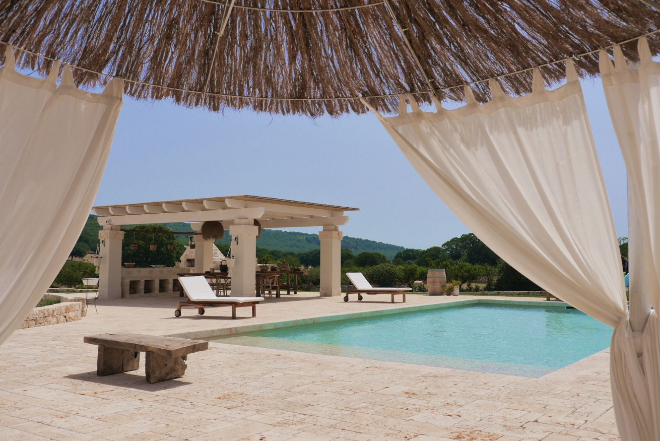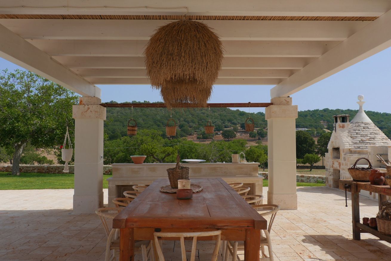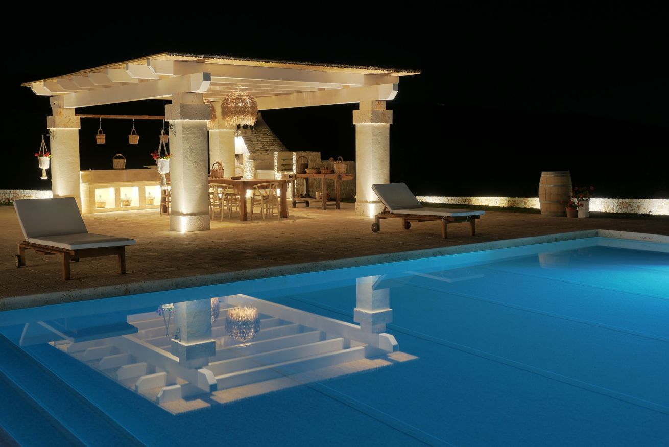 L’ampio spazio esterno insiste su una “vecchia aia restaurata” e dispone di piscina e angoli relax. E’ a disposizione una cucina completamente attrezzata, il barbeque in pietra e fare la pizza nel forno a legna a forma di trullo.
